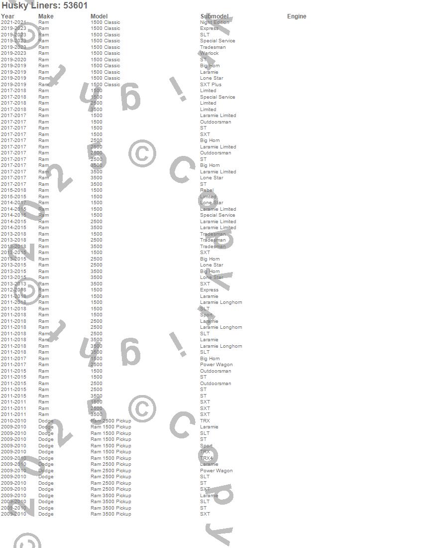 Below is an abreviated list of applications for the X-act Contour Floor Liner.