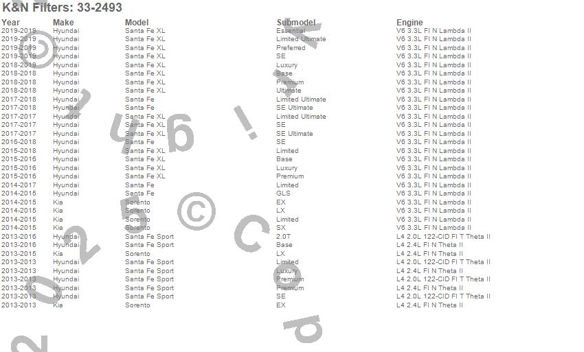 Below is an abreviated list of applications for the Air Filter.