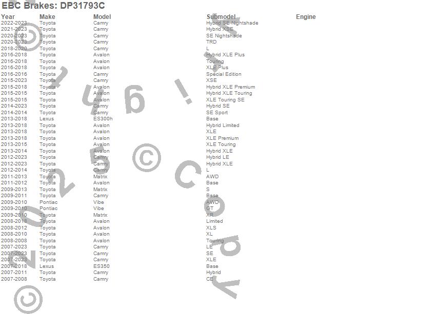 Below is an abreviated list of applications for the EBC Redstuff Ceramic Low Dust Brake Pads. Avalon, Camry, ES300h, ES350, Matrix, Vibe, Lexus, Pontiac, Toyota, 2016, 2015, 2014, 2013, 2012, 2011, 2010, 2009, 2008, 2007 more…