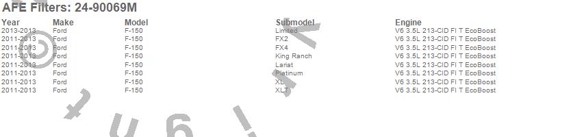 Below is an abreviated list of applications for the MagnumFLOW Intake PRO 5R EcoBoost Stage 2 Air Filter.