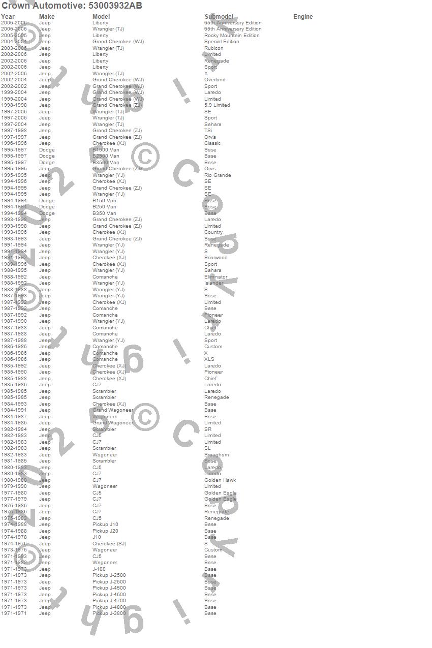 B150 Van, B1500 Van, B250 Van, B2500 Van, B350 Van, B3500 Van, Cherokee (SJ), Cherokee (XJ), CJ5, CJ7, Comanche, Grand Cherokee (WJ), Grand Cherokee (ZJ), Grand Wagoneer, J-100, J-2500, J-2600, J-3800, J-4500, J-4600 more…