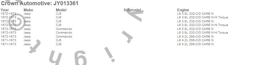 Crown Automotive is the premier manufacturer and distributor of quality replacement parts for Jeep® CJ™, Wrangler™, Cherokee™, Grand Cherokee™, Liberty™, and Commander™."From humble beginnings in 1963 in a small Boston storefront, Crown Automotive has consistently maintained its commitment to offering only quality parts and exceptional service. Today, with warehouses in Massachusetts, Georgia, Nevada, Spain, and the Czech Republic, totaling over 160,000 square feet, Crown Automotive continues to be the leader in quality replacement parts for Jeep® vehicles. With over 8,000 different parts in stock for Jeep® vehicles from 1942 on up, Crown has the largest stock of replacement parts for Jeep® vehicles, including factory-discontinued parts. In fact, many of the older Jeeps are still on (and off) the road thanks to Crown parts. The Crown line consists of axle, body, brake, clutch, cooling, driveline, electrical, engine, exhaust, fuel, steering, suspension, transmission and transfer case components. Crown Automotive also offers an exclusive line of component kits and accessory products. Because we know that Jeeps are driven harder than most other vehicles, we emphasize offering only quality parts. In fact, we test parts on Jeeps before distributing them to our dealers to insure that they meet our standards for quality. Crown also supports its entire line with a 12 month/12,000 mile warranty to insure our dealers and their customers of our commitment to offering quality parts. We know from experience that Jeep® owners would rather pay a little more for a good quality part that's backed by a strong guarantee. But we know that price is important as well. So, not only will you find Crown parts to be of exceptional quality, but you'll find them at a great price too.