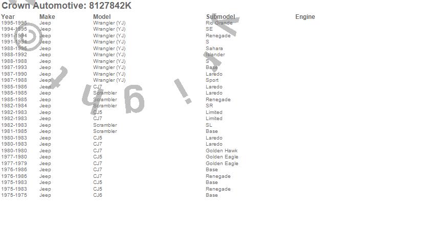 Crown Automotive is the premier manufacturer and distributor of quality replacement parts for Jeep® CJ™, Wrangler™, Cherokee™, Grand Cherokee™, Liberty™, and Commander™."From humble beginnings in 1963 in a small Boston storefront, Crown Automotive has consistently maintained its commitment to offering only quality parts and exceptional service. Today, with warehouses in Massachusetts, Georgia, Nevada, Spain, and the Czech Republic, totaling over 160,000 square feet, Crown Automotive continues to be the leader in quality replacement parts for Jeep® vehicles. With over 8,000 different parts in stock for Jeep® vehicles from 1942 on up, Crown has the largest stock of replacement parts for Jeep® vehicles, including factory-discontinued parts. In fact, many of the older Jeeps are still on (and off) the road thanks to Crown parts. The Crown line consists of axle, body, brake, clutch, cooling, driveline, electrical, engine, exhaust, fuel, steering, suspension, transmission and transfer case components. Crown Automotive also offers an exclusive line of component kits and accessory products. Because we know that Jeeps are driven harder than most other vehicles, we emphasize offering only quality parts. In fact, we test parts on Jeeps before distributing them to our dealers to insure that they meet our standards for quality. Crown also supports its entire line with a 12 month/12,000 mile warranty to insure our dealers and their customers of our commitment to offering quality parts. We know from experience that Jeep® owners would rather pay a little more for a good quality part that's backed by a strong guarantee. But we know that price is important as well. So, not only will you find Crown parts to be of exceptional quality, but you'll find them at a great price too.