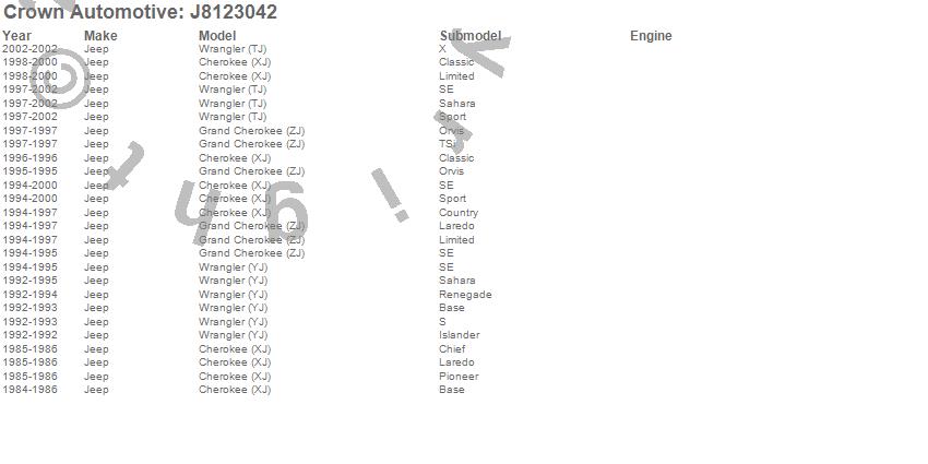 Cherokee (XJ), Grand Cherokee (ZJ), Wrangler (TJ), Wrangler (YJ), Jeep, 2002, 2001, 2000, 1999, 1998, 1997, 1996, 1995, 1994, 1993, 1992, 1986, 1985, 1984 more…