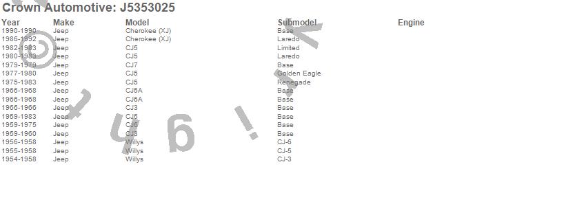 Crown Automotive is the premier manufacturer and distributor of quality replacement parts for Jeep® CJ™, Wrangler™, Cherokee™, Grand Cherokee™, Liberty™, and Commander™."From humble beginnings in 1963 in a small Boston storefront, Crown Automotive has consistently maintained its commitment to offering only quality parts and exceptional service. Today, with warehouses in Massachusetts, Georgia, Nevada, Spain, and the Czech Republic, totaling over 160,000 square feet, Crown Automotive continues to be the leader in quality replacement parts for Jeep® vehicles. With over 8,000 different parts in stock for Jeep® vehicles from 1942 on up, Crown has the largest stock of replacement parts for Jeep® vehicles, including factory-discontinued parts. In fact, many of the older Jeeps are still on (and off) the road thanks to Crown parts. The Crown line consists of axle, body, brake, clutch, cooling, driveline, electrical, engine, exhaust, fuel, steering, suspension, transmission and transfer case components. Crown Automotive also offers an exclusive line of component kits and accessory products. Because we know that Jeeps are driven harder than most other vehicles, we emphasize offering only quality parts. In fact, we test parts on Jeeps before distributing them to our dealers to insure that they meet our standards for quality. Crown also supports its entire line with a 12 month/12,000 mile warranty to insure our dealers and their customers of our commitment to offering quality parts. We know from experience that Jeep® owners would rather pay a little more for a good quality part that's backed by a strong guarantee. But we know that price is important as well. So, not only will you find Crown parts to be of exceptional quality, but you'll find them at a great price too.