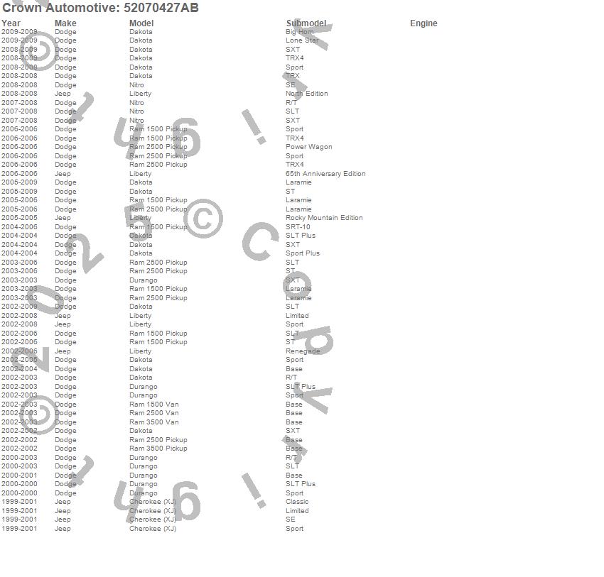 Cherokee (XJ), Dakota, Durango, Liberty, Nitro, Ram 1500, Ram 1500 Van, Ram 2500, Ram 2500 Van, Ram 3500, Ram 3500 Van, Dodge, Jeep, 2009, 2008, 2007, 2006, 2005, 2004, 2003 more…