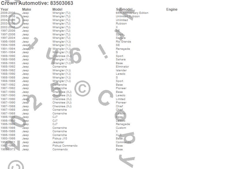 Crown Automotive is the premier manufacturer and distributor of quality replacement parts for Jeep® CJ™, Wrangler™, Cherokee™, Grand Cherokee™, Liberty™, and Commander™."From humble beginnings in 1963 in a small Boston storefront, Crown Automotive has consistently maintained its commitment to offering only quality parts and exceptional service. Today, with warehouses in Massachusetts, Georgia, Nevada, Spain, and the Czech Republic, totaling over 160,000 square feet, Crown Automotive continues to be the leader in quality replacement parts for Jeep® vehicles. With over 8,000 different parts in stock for Jeep® vehicles from 1942 on up, Crown has the largest stock of replacement parts for Jeep® vehicles, including factory-discontinued parts. In fact, many of the older Jeeps are still on (and off) the road thanks to Crown parts. The Crown line consists of axle, body, brake, clutch, cooling, driveline, electrical, engine, exhaust, fuel, steering, suspension, transmission and transfer case components. Crown Automotive also offers an exclusive line of component kits and accessory products. Because we know that Jeeps are driven harder than most other vehicles, we emphasize offering only quality parts. In fact, we test parts on Jeeps before distributing them to our dealers to insure that they meet our standards for quality. Crown also supports its entire line with a 12 month/12,000 mile warranty to insure our dealers and their customers of our commitment to offering quality parts. We know from experience that Jeep® owners would rather pay a little more for a good quality part that's backed by a strong guarantee. But we know that price is important as well. So, not only will you find Crown parts to be of exceptional quality, but you'll find them at a great price too.