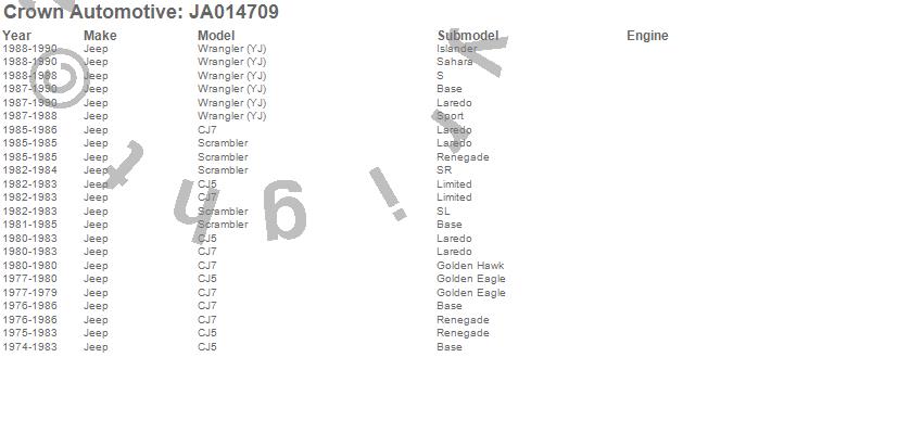 Crown Automotive is the premier manufacturer and distributor of quality replacement parts for Jeep® CJ™, Wrangler™, Cherokee™, Grand Cherokee™, Liberty™, and Commander™."From humble beginnings in 1963 in a small Boston storefront, Crown Automotive has consistently maintained its commitment to offering only quality parts and exceptional service. Today, with warehouses in Massachusetts, Georgia, Nevada, Spain, and the Czech Republic, totaling over 160,000 square feet, Crown Automotive continues to be the leader in quality replacement parts for Jeep® vehicles. With over 8,000 different parts in stock for Jeep® vehicles from 1942 on up, Crown has the largest stock of replacement parts for Jeep® vehicles, including factory-discontinued parts. In fact, many of the older Jeeps are still on (and off) the road thanks to Crown parts. The Crown line consists of axle, body, brake, clutch, cooling, driveline, electrical, engine, exhaust, fuel, steering, suspension, transmission and transfer case components. Crown Automotive also offers an exclusive line of component kits and accessory products. Because we know that Jeeps are driven harder than most other vehicles, we emphasize offering only quality parts. In fact, we test parts on Jeeps before distributing them to our dealers to insure that they meet our standards for quality. Crown also supports its entire line with a 12 month/12,000 mile warranty to insure our dealers and their customers of our commitment to offering quality parts. We know from experience that Jeep® owners would rather pay a little more for a good quality part that's backed by a strong guarantee. But we know that price is important as well. So, not only will you find Crown parts to be of exceptional quality, but you'll find them at a great price too.