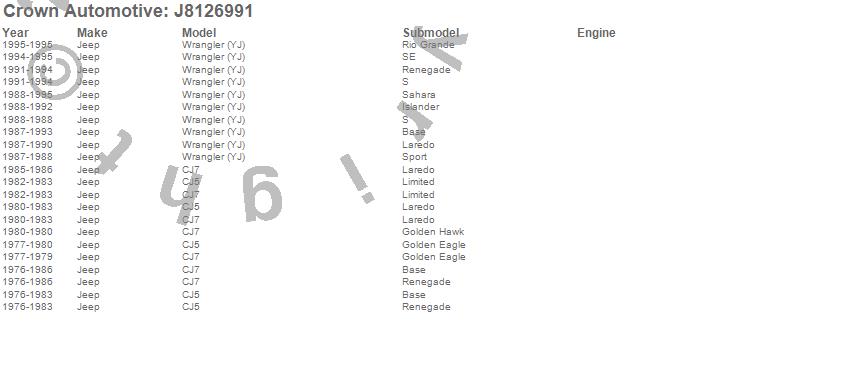 Crown Automotive is the premier manufacturer and distributor of quality replacement parts for Jeep® CJ™, Wrangler™, Cherokee™, Grand Cherokee™, Liberty™, and Commander™."From humble beginnings in 1963 in a small Boston storefront, Crown Automotive has consistently maintained its commitment to offering only quality parts and exceptional service. Today, with warehouses in Massachusetts, Georgia, Nevada, Spain, and the Czech Republic, totaling over 160,000 square feet, Crown Automotive continues to be the leader in quality replacement parts for Jeep® vehicles. With over 8,000 different parts in stock for Jeep® vehicles from 1942 on up, Crown has the largest stock of replacement parts for Jeep® vehicles, including factory-discontinued parts. In fact, many of the older Jeeps are still on (and off) the road thanks to Crown parts. The Crown line consists of axle, body, brake, clutch, cooling, driveline, electrical, engine, exhaust, fuel, steering, suspension, transmission and transfer case components. Crown Automotive also offers an exclusive line of component kits and accessory products. Because we know that Jeeps are driven harder than most other vehicles, we emphasize offering only quality parts. In fact, we test parts on Jeeps before distributing them to our dealers to insure that they meet our standards for quality. Crown also supports its entire line with a 12 month/12,000 mile warranty to insure our dealers and their customers of our commitment to offering quality parts. We know from experience that Jeep® owners would rather pay a little more for a good quality part that's backed by a strong guarantee. But we know that price is important as well. So, not only will you find Crown parts to be of exceptional quality, but you'll find them at a great price too.
