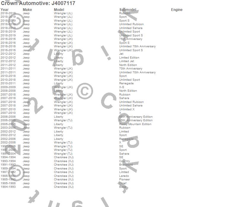 Crown Automotive is the premier manufacturer and distributor of quality replacement parts for Jeep® CJ™, Wrangler™, Cherokee™, Grand Cherokee™, Liberty™, and Commander™."From humble beginnings in 1963 in a small Boston storefront, Crown Automotive has consistently maintained its commitment to offering only quality parts and exceptional service. Today, with warehouses in Massachusetts, Georgia, Nevada, Spain, and the Czech Republic, totaling over 160,000 square feet, Crown Automotive continues to be the leader in quality replacement parts for Jeep® vehicles. With over 8,000 different parts in stock for Jeep® vehicles from 1942 on up, Crown has the largest stock of replacement parts for Jeep® vehicles, including factory-discontinued parts. In fact, many of the older Jeeps are still on (and off) the road thanks to Crown parts. The Crown line consists of axle, body, brake, clutch, cooling, driveline, electrical, engine, exhaust, fuel, steering, suspension, transmission and transfer case components. Crown Automotive also offers an exclusive line of component kits and accessory products. Because we know that Jeeps are driven harder than most other vehicles, we emphasize offering only quality parts. In fact, we test parts on Jeeps before distributing them to our dealers to insure that they meet our standards for quality. Crown also supports its entire line with a 12 month/12,000 mile warranty to insure our dealers and their customers of our commitment to offering quality parts. We know from experience that Jeep® owners would rather pay a little more for a good quality part that's backed by a strong guarantee. But we know that price is important as well. So, not only will you find Crown parts to be of exceptional quality, but you'll find them at a great price too.