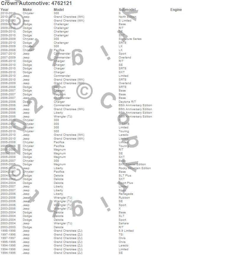 300, Challenger, Charger, Commander, Dakota, Grand Cherokee (WK), Grand Cherokee (ZJ), Liberty, Magnum, Pacifica, Wrangler (TJ), Chrysler, Dodge, Jeep, 2010, 2009, 2008, 2007, 2006, 2005 more…