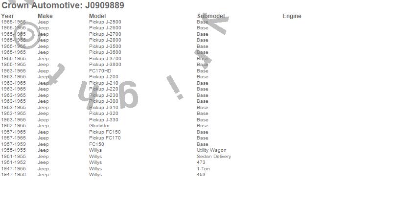 Crown Automotive is the premier manufacturer and distributor of quality replacement parts for Jeep® CJ™, Wrangler™, Cherokee™, Grand Cherokee™, Liberty™, and Commander™."From humble beginnings in 1963 in a small Boston storefront, Crown Automotive has consistently maintained its commitment to offering only quality parts and exceptional service. Today, with warehouses in Massachusetts, Georgia, Nevada, Spain, and the Czech Republic, totaling over 160,000 square feet, Crown Automotive continues to be the leader in quality replacement parts for Jeep® vehicles. With over 8,000 different parts in stock for Jeep® vehicles from 1942 on up, Crown has the largest stock of replacement parts for Jeep® vehicles, including factory-discontinued parts. In fact, many of the older Jeeps are still on (and off) the road thanks to Crown parts. The Crown line consists of axle, body, brake, clutch, cooling, driveline, electrical, engine, exhaust, fuel, steering, suspension, transmission and transfer case components. Crown Automotive also offers an exclusive line of component kits and accessory products. Because we know that Jeeps are driven harder than most other vehicles, we emphasize offering only quality parts. In fact, we test parts on Jeeps before distributing them to our dealers to insure that they meet our standards for quality. Crown also supports its entire line with a 12 month/12,000 mile warranty to insure our dealers and their customers of our commitment to offering quality parts. We know from experience that Jeep® owners would rather pay a little more for a good quality part that's backed by a strong guarantee. But we know that price is important as well. So, not only will you find Crown parts to be of exceptional quality, but you'll find them at a great price too.