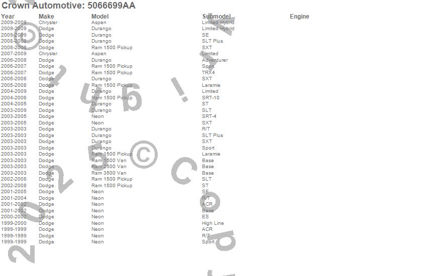 Aspen, Durango, Neon, Ram 1500, Ram 1500 Van, Ram 2500 Van, Ram 3500 Van, Chrysler, Dodge, 2009, 2008, 2007, 2006, 2005, 2004, 2003, 2002, 2001, 2000, 1999 more…