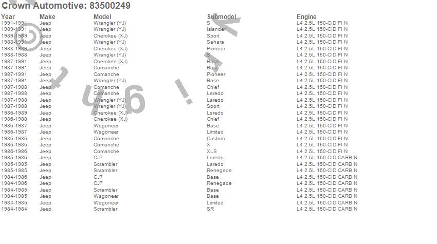 Cherokee (XJ), CJ7, Comanche, DJ5M, Scrambler, Wagoneer, Wrangler (YJ), Jeep, 1991, 1990, 1989, 1988, 1987, 1986, 1985, 1984, 1983 more…