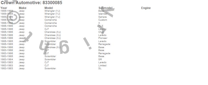Cherokee (XJ), CJ7, Comanche, Scrambler, Wrangler (YJ), Jeep, 1989, 1986, 1985, 1984, 1983 more…