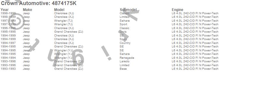 Crown Automotive is the premier manufacturer and distributor of quality replacement parts for Jeep® CJ™, Wrangler™, Cherokee™, Grand Cherokee™, Liberty™, and Commander™."From humble beginnings in 1963 in a small Boston storefront, Crown Automotive has consistently maintained its commitment to offering only quality parts and exceptional service. Today, with warehouses in Massachusetts, Georgia, Nevada, Spain, and the Czech Republic, totaling over 160,000 square feet, Crown Automotive continues to be the leader in quality replacement parts for Jeep® vehicles. With over 8,000 different parts in stock for Jeep® vehicles from 1942 on up, Crown has the largest stock of replacement parts for Jeep® vehicles, including factory-discontinued parts. In fact, many of the older Jeeps are still on (and off) the road thanks to Crown parts. The Crown line consists of axle, body, brake, clutch, cooling, driveline, electrical, engine, exhaust, fuel, steering, suspension, transmission and transfer case components. Crown Automotive also offers an exclusive line of component kits and accessory products. Because we know that Jeeps are driven harder than most other vehicles, we emphasize offering only quality parts. In fact, we test parts on Jeeps before distributing them to our dealers to insure that they meet our standards for quality. Crown also supports its entire line with a 12 month/12,000 mile warranty to insure our dealers and their customers of our commitment to offering quality parts. We know from experience that Jeep® owners would rather pay a little more for a good quality part that's backed by a strong guarantee. But we know that price is important as well. So, not only will you find Crown parts to be of exceptional quality, but you'll find them at a great price too.