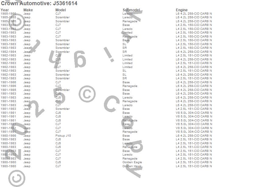 Crown Automotive is the premier manufacturer and distributor of quality replacement parts for Jeep® CJ™, Wrangler™, Cherokee™, Grand Cherokee™, Liberty™, and Commander™."From humble beginnings in 1963 in a small Boston storefront, Crown Automotive has consistently maintained its commitment to offering only quality parts and exceptional service. Today, with warehouses in Massachusetts, Georgia, Nevada, Spain, and the Czech Republic, totaling over 160,000 square feet, Crown Automotive continues to be the leader in quality replacement parts for Jeep® vehicles. With over 8,000 different parts in stock for Jeep® vehicles from 1942 on up, Crown has the largest stock of replacement parts for Jeep® vehicles, including factory-discontinued parts. In fact, many of the older Jeeps are still on (and off) the road thanks to Crown parts. The Crown line consists of axle, body, brake, clutch, cooling, driveline, electrical, engine, exhaust, fuel, steering, suspension, transmission and transfer case components. Crown Automotive also offers an exclusive line of component kits and accessory products. Because we know that Jeeps are driven harder than most other vehicles, we emphasize offering only quality parts. In fact, we test parts on Jeeps before distributing them to our dealers to insure that they meet our standards for quality. Crown also supports its entire line with a 12 month/12,000 mile warranty to insure our dealers and their customers of our commitment to offering quality parts. We know from experience that Jeep® owners would rather pay a little more for a good quality part that's backed by a strong guarantee. But we know that price is important as well. So, not only will you find Crown parts to be of exceptional quality, but you'll find them at a great price too.
