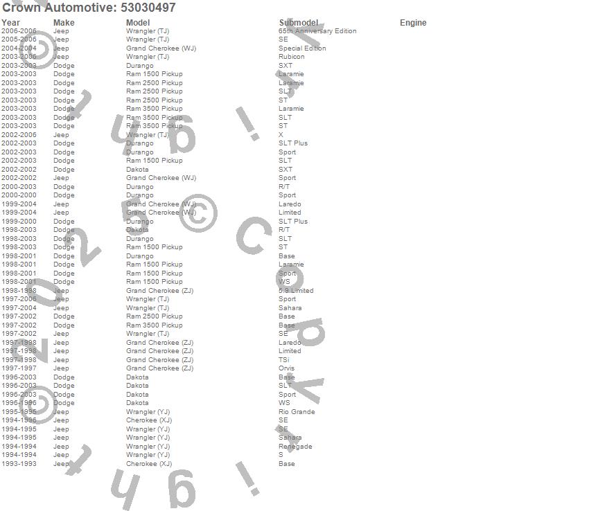 Cherokee (XJ), Dakota, Durango, Grand Cherokee (WJ), Grand Cherokee (ZJ), Ram 1500, Ram 2500, Ram 3500, Wrangler (TJ), Wrangler (YJ), Dodge, Jeep, 2006, 2005, 2004, 2003, 2002, 2001, 2000, 1999 more…