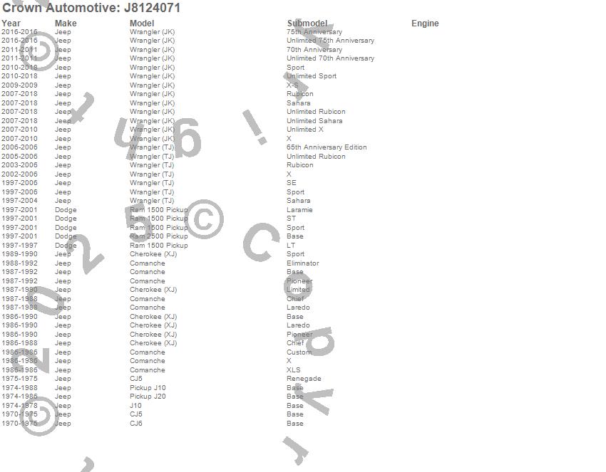 Crown Automotive is the premier manufacturer and distributor of quality replacement parts for Jeep® CJ™, Wrangler™, Cherokee™, Grand Cherokee™, Liberty™, and Commander™."From humble beginnings in 1963 in a small Boston storefront, Crown Automotive has consistently maintained its commitment to offering only quality parts and exceptional service. Today, with warehouses in Massachusetts, Georgia, Nevada, Spain, and the Czech Republic, totaling over 160,000 square feet, Crown Automotive continues to be the leader in quality replacement parts for Jeep® vehicles. With over 8,000 different parts in stock for Jeep® vehicles from 1942 on up, Crown has the largest stock of replacement parts for Jeep® vehicles, including factory-discontinued parts. In fact, many of the older Jeeps are still on (and off) the road thanks to Crown parts. The Crown line consists of axle, body, brake, clutch, cooling, driveline, electrical, engine, exhaust, fuel, steering, suspension, transmission and transfer case components. Crown Automotive also offers an exclusive line of component kits and accessory products. Because we know that Jeeps are driven harder than most other vehicles, we emphasize offering only quality parts. In fact, we test parts on Jeeps before distributing them to our dealers to insure that they meet our standards for quality. Crown also supports its entire line with a 12 month/12,000 mile warranty to insure our dealers and their customers of our commitment to offering quality parts. We know from experience that Jeep® owners would rather pay a little more for a good quality part that's backed by a strong guarantee. But we know that price is important as well. So, not only will you find Crown parts to be of exceptional quality, but you'll find them at a great price too.