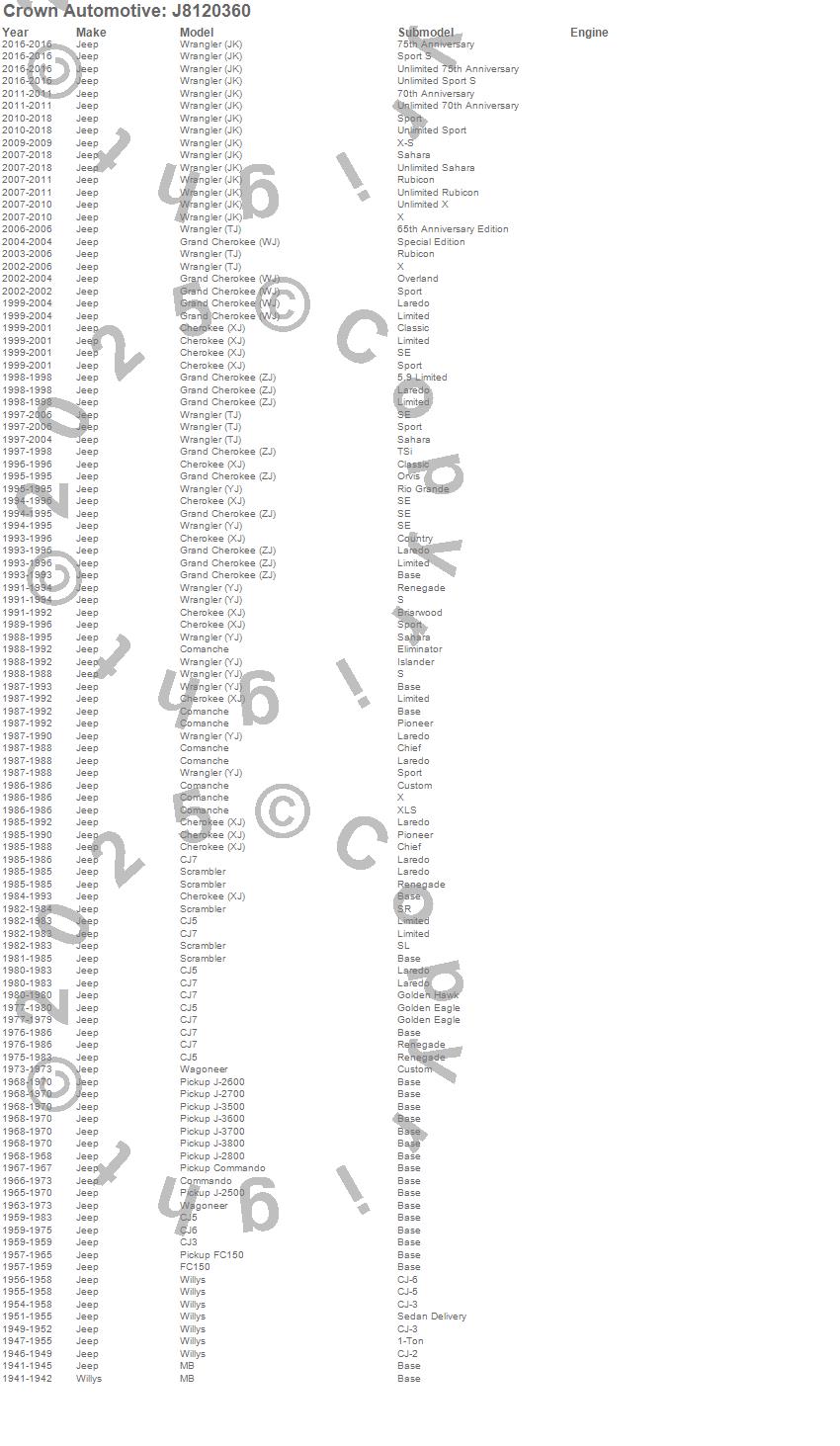 1-Ton Pickup, Cherokee (XJ), CJ-2A, CJ-3A, CJ-3B, CJ5, CJ6, CJ7, Comanche, Commando, FC150, Grand Cherokee (WJ), Grand Cherokee (ZJ), J-2500, J-2600, J-2700, J-2800, J-3500, J-3600, J-3700 more…