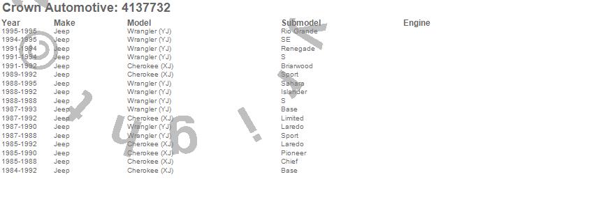 Crown Automotive is the premier manufacturer and distributor of quality replacement parts for Jeep® CJ™, Wrangler™, Cherokee™, Grand Cherokee™, Liberty™, and Commander™."From humble beginnings in 1963 in a small Boston storefront, Crown Automotive has consistently maintained its commitment to offering only quality parts and exceptional service. Today, with warehouses in Massachusetts, Georgia, Nevada, Spain, and the Czech Republic, totaling over 160,000 square feet, Crown Automotive continues to be the leader in quality replacement parts for Jeep® vehicles. With over 8,000 different parts in stock for Jeep® vehicles from 1942 on up, Crown has the largest stock of replacement parts for Jeep® vehicles, including factory-discontinued parts. In fact, many of the older Jeeps are still on (and off) the road thanks to Crown parts. The Crown line consists of axle, body, brake, clutch, cooling, driveline, electrical, engine, exhaust, fuel, steering, suspension, transmission and transfer case components. Crown Automotive also offers an exclusive line of component kits and accessory products. Because we know that Jeeps are driven harder than most other vehicles, we emphasize offering only quality parts. In fact, we test parts on Jeeps before distributing them to our dealers to insure that they meet our standards for quality. Crown also supports its entire line with a 12 month/12,000 mile warranty to insure our dealers and their customers of our commitment to offering quality parts. We know from experience that Jeep® owners would rather pay a little more for a good quality part that's backed by a strong guarantee. But we know that price is important as well. So, not only will you find Crown parts to be of exceptional quality, but you'll find them at a great price too.