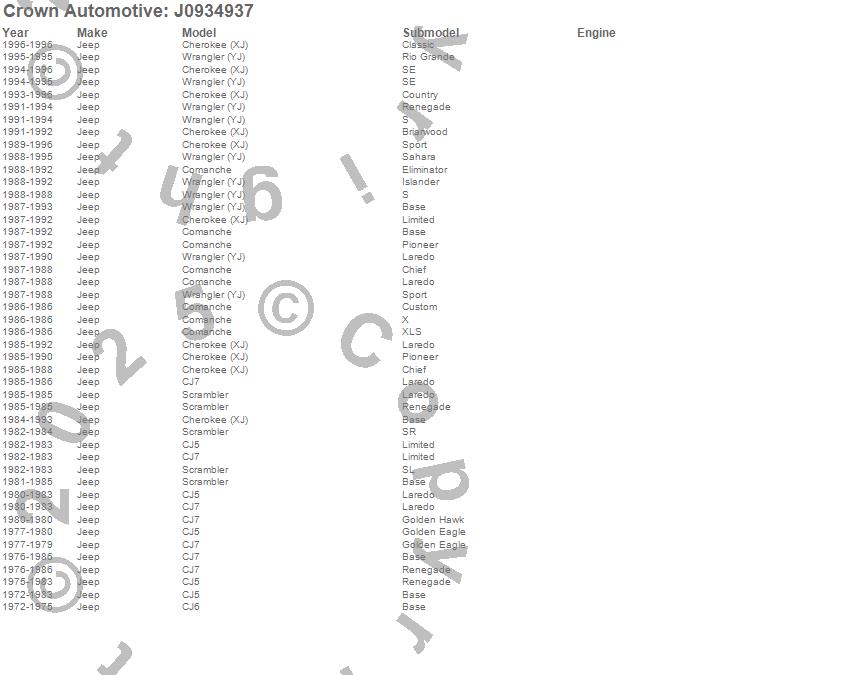 Cherokee (XJ), CJ5, CJ6, CJ7, Comanche, Scrambler, Wrangler (YJ), Jeep, 1996, 1995, 1994, 1993, 1992, 1991, 1990, 1989, 1988, 1987, 1986, 1985 more…