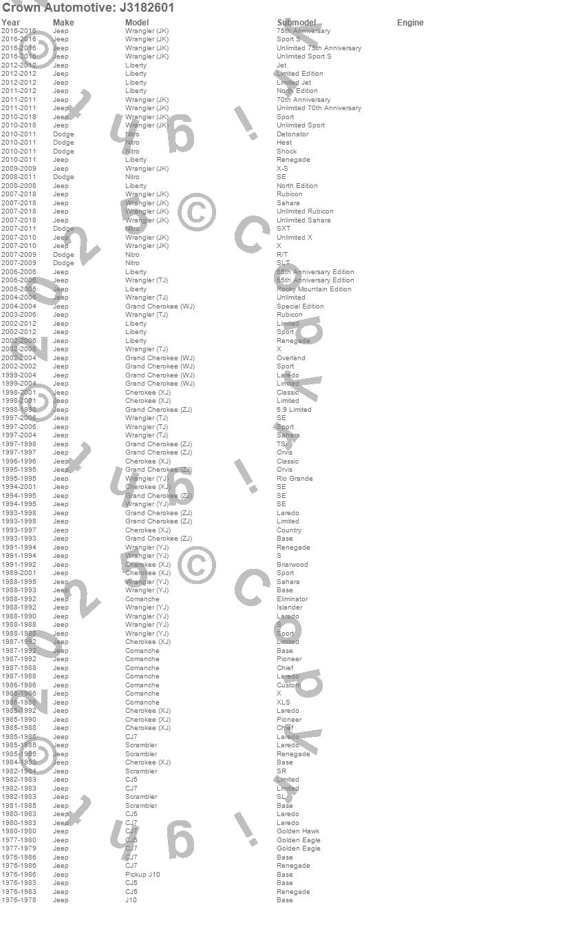 Crown Automotive is the premier manufacturer and distributor of quality replacement parts for Jeep® CJ™, Wrangler™, Cherokee™, Grand Cherokee™, Liberty™, and Commander™."From humble beginnings in 1963 in a small Boston storefront, Crown Automotive has consistently maintained its commitment to offering only quality parts and exceptional service. Today, with warehouses in Massachusetts, Georgia, Nevada, Spain, and the Czech Republic, totaling over 160,000 square feet, Crown Automotive continues to be the leader in quality replacement parts for Jeep® vehicles. With over 8,000 different parts in stock for Jeep® vehicles from 1942 on up, Crown has the largest stock of replacement parts for Jeep® vehicles, including factory-discontinued parts. In fact, many of the older Jeeps are still on (and off) the road thanks to Crown parts. The Crown line consists of axle, body, brake, clutch, cooling, driveline, electrical, engine, exhaust, fuel, steering, suspension, transmission and transfer case components. Crown Automotive also offers an exclusive line of component kits and accessory products. Because we know that Jeeps are driven harder than most other vehicles, we emphasize offering only quality parts. In fact, we test parts on Jeeps before distributing them to our dealers to insure that they meet our standards for quality. Crown also supports its entire line with a 12 month/12,000 mile warranty to insure our dealers and their customers of our commitment to offering quality parts. We know from experience that Jeep® owners would rather pay a little more for a good quality part that's backed by a strong guarantee. But we know that price is important as well. So, not only will you find Crown parts to be of exceptional quality, but you'll find them at a great price too.