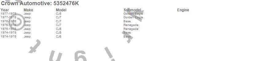 Crown Automotive is the premier manufacturer and distributor of quality replacement parts for Jeep® CJ™, Wrangler™, Cherokee™, Grand Cherokee™, Liberty™, and Commander™."From humble beginnings in 1963 in a small Boston storefront, Crown Automotive has consistently maintained its commitment to offering only quality parts and exceptional service. Today, with warehouses in Massachusetts, Georgia, Nevada, Spain, and the Czech Republic, totaling over 160,000 square feet, Crown Automotive continues to be the leader in quality replacement parts for Jeep® vehicles. With over 8,000 different parts in stock for Jeep® vehicles from 1942 on up, Crown has the largest stock of replacement parts for Jeep® vehicles, including factory-discontinued parts. In fact, many of the older Jeeps are still on (and off) the road thanks to Crown parts. The Crown line consists of axle, body, brake, clutch, cooling, driveline, electrical, engine, exhaust, fuel, steering, suspension, transmission and transfer case components. Crown Automotive also offers an exclusive line of component kits and accessory products. Because we know that Jeeps are driven harder than most other vehicles, we emphasize offering only quality parts. In fact, we test parts on Jeeps before distributing them to our dealers to insure that they meet our standards for quality. Crown also supports its entire line with a 12 month/12,000 mile warranty to insure our dealers and their customers of our commitment to offering quality parts. We know from experience that Jeep® owners would rather pay a little more for a good quality part that's backed by a strong guarantee. But we know that price is important as well. So, not only will you find Crown parts to be of exceptional quality, but you'll find them at a great price too.