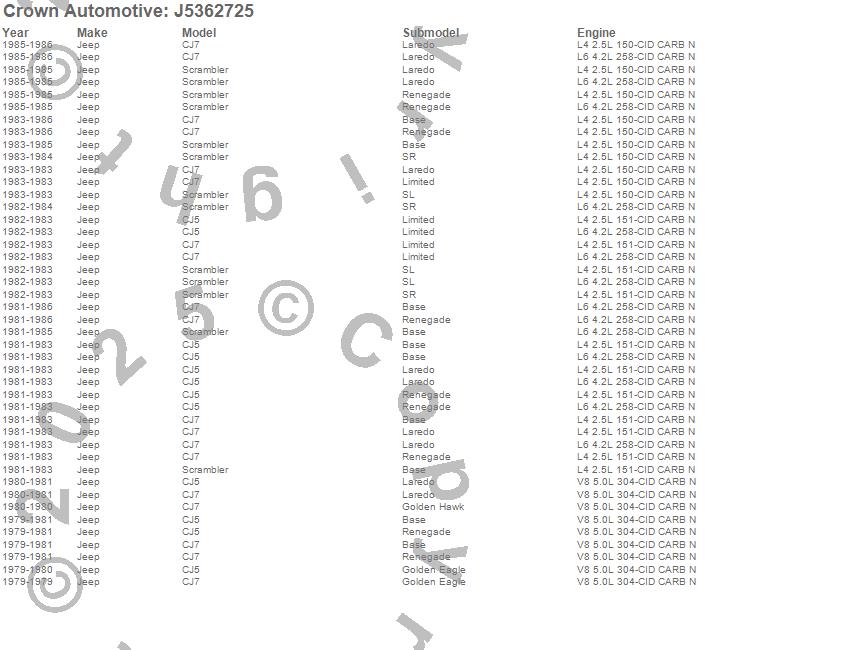 Crown Automotive is the premier manufacturer and distributor of quality replacement parts for Jeep® CJ™, Wrangler™, Cherokee™, Grand Cherokee™, Liberty™, and Commander™."From humble beginnings in 1963 in a small Boston storefront, Crown Automotive has consistently maintained its commitment to offering only quality parts and exceptional service. Today, with warehouses in Massachusetts, Georgia, Nevada, Spain, and the Czech Republic, totaling over 160,000 square feet, Crown Automotive continues to be the leader in quality replacement parts for Jeep® vehicles. With over 8,000 different parts in stock for Jeep® vehicles from 1942 on up, Crown has the largest stock of replacement parts for Jeep® vehicles, including factory-discontinued parts. In fact, many of the older Jeeps are still on (and off) the road thanks to Crown parts. The Crown line consists of axle, body, brake, clutch, cooling, driveline, electrical, engine, exhaust, fuel, steering, suspension, transmission and transfer case components. Crown Automotive also offers an exclusive line of component kits and accessory products. Because we know that Jeeps are driven harder than most other vehicles, we emphasize offering only quality parts. In fact, we test parts on Jeeps before distributing them to our dealers to insure that they meet our standards for quality. Crown also supports its entire line with a 12 month/12,000 mile warranty to insure our dealers and their customers of our commitment to offering quality parts. We know from experience that Jeep® owners would rather pay a little more for a good quality part that's backed by a strong guarantee. But we know that price is important as well. So, not only will you find Crown parts to be of exceptional quality, but you'll find them at a great price too.