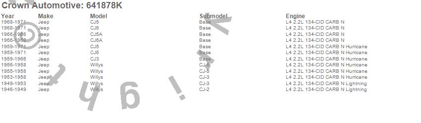 Crown Automotive is the premier manufacturer and distributor of quality replacement parts for Jeep® CJ™, Wrangler™, Cherokee™, Grand Cherokee™, Liberty™, and Commander™."From humble beginnings in 1963 in a small Boston storefront, Crown Automotive has consistently maintained its commitment to offering only quality parts and exceptional service. Today, with warehouses in Massachusetts, Georgia, Nevada, Spain, and the Czech Republic, totaling over 160,000 square feet, Crown Automotive continues to be the leader in quality replacement parts for Jeep® vehicles. With over 8,000 different parts in stock for Jeep® vehicles from 1942 on up, Crown has the largest stock of replacement parts for Jeep® vehicles, including factory-discontinued parts. In fact, many of the older Jeeps are still on (and off) the road thanks to Crown parts. The Crown line consists of axle, body, brake, clutch, cooling, driveline, electrical, engine, exhaust, fuel, steering, suspension, transmission and transfer case components. Crown Automotive also offers an exclusive line of component kits and accessory products. Because we know that Jeeps are driven harder than most other vehicles, we emphasize offering only quality parts. In fact, we test parts on Jeeps before distributing them to our dealers to insure that they meet our standards for quality. Crown also supports its entire line with a 12 month/12,000 mile warranty to insure our dealers and their customers of our commitment to offering quality parts. We know from experience that Jeep® owners would rather pay a little more for a good quality part that's backed by a strong guarantee. But we know that price is important as well. So, not only will you find Crown parts to be of exceptional quality, but you'll find them at a great price too.