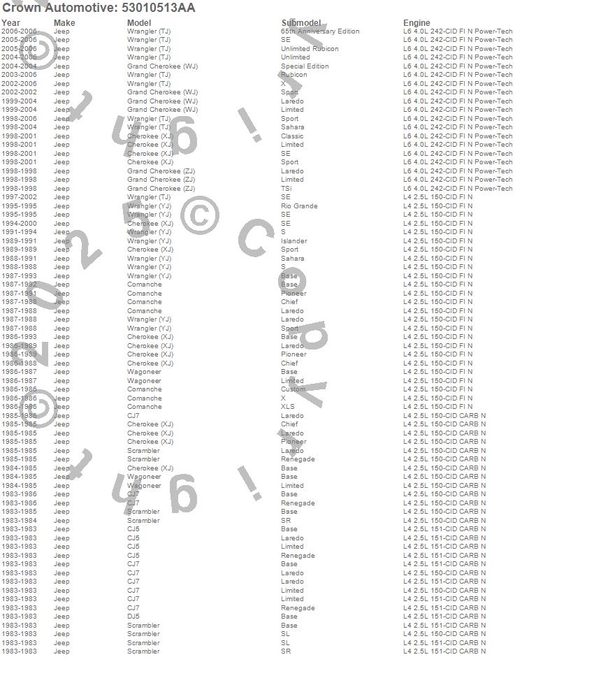 Cherokee (XJ), CJ5, CJ7, Comanche, DJ5, DJ5M, Grand Cherokee (WJ), Grand Cherokee (ZJ), Scrambler, Wagoneer, Wrangler (LJ), Wrangler (TJ), Wrangler (YJ), Jeep, 2006, 2005, 2004, 2003, 2002, 2001 more…