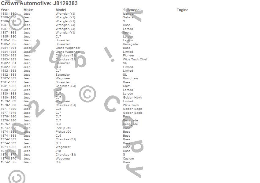 Cherokee (SJ), CJ5, CJ6, CJ7, DJ5, DJ5C, DJ5F, Grand Wagoneer, J10, J20, Scrambler, Wagoneer, Wrangler (YJ), Jeep, 1991, 1990, 1989, 1988, 1987, 1986 more…