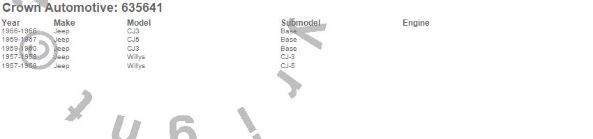 Crown Automotive is the premier manufacturer and distributor of quality replacement parts for Jeep® CJ™, Wrangler™, Cherokee™, Grand Cherokee™, Liberty™, and Commander™."From humble beginnings in 1963 in a small Boston storefront, Crown Automotive has consistently maintained its commitment to offering only quality parts and exceptional service. Today, with warehouses in Massachusetts, Georgia, Nevada, Spain, and the Czech Republic, totaling over 160,000 square feet, Crown Automotive continues to be the leader in quality replacement parts for Jeep® vehicles. With over 8,000 different parts in stock for Jeep® vehicles from 1942 on up, Crown has the largest stock of replacement parts for Jeep® vehicles, including factory-discontinued parts. In fact, many of the older Jeeps are still on (and off) the road thanks to Crown parts. The Crown line consists of axle, body, brake, clutch, cooling, driveline, electrical, engine, exhaust, fuel, steering, suspension, transmission and transfer case components. Crown Automotive also offers an exclusive line of component kits and accessory products. Because we know that Jeeps are driven harder than most other vehicles, we emphasize offering only quality parts. In fact, we test parts on Jeeps before distributing them to our dealers to insure that they meet our standards for quality. Crown also supports its entire line with a 12 month/12,000 mile warranty to insure our dealers and their customers of our commitment to offering quality parts. We know from experience that Jeep® owners would rather pay a little more for a good quality part that's backed by a strong guarantee. But we know that price is important as well. So, not only will you find Crown parts to be of exceptional quality, but you'll find them at a great price too.