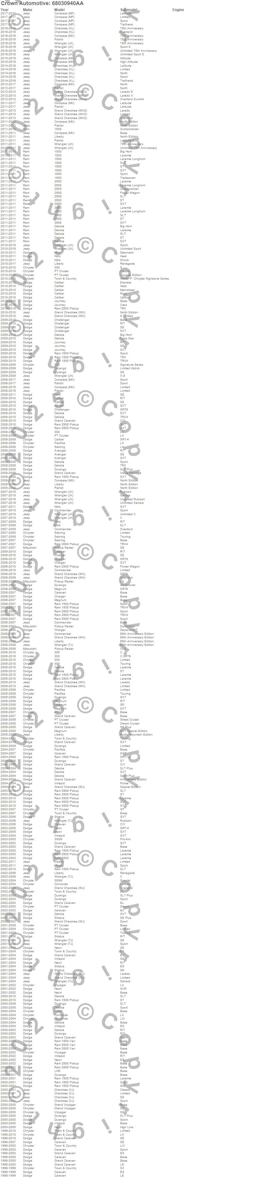 1500, 2500, 300, 300M, 3500, Avenger, Caliber, Caravan, Challenger, Charger, Cherokee (XJ), Commander, Compass, Concorde, Dakota, Durango, Grand Caravan, Grand Cherokee (WJ), Grand Cherokee (WK), Grand Cherokee (WK2) more…