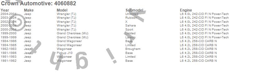 Grand Cherokee (WJ), Grand Wagoneer, J10, Wagoneer, Wrangler (LJ), Wrangler (TJ), Jeep, 2004, 2003, 2002, 2001, 2000, 1999, 1986, 1985, 1984, 1983, 1982, 1981 more…