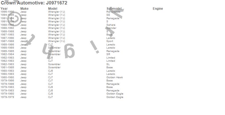 Crown Automotive is the premier manufacturer and distributor of quality replacement parts for Jeep® CJ™, Wrangler™, Cherokee™, Grand Cherokee™, Liberty™, and Commander™."From humble beginnings in 1963 in a small Boston storefront, Crown Automotive has consistently maintained its commitment to offering only quality parts and exceptional service. Today, with warehouses in Massachusetts, Georgia, Nevada, Spain, and the Czech Republic, totaling over 160,000 square feet, Crown Automotive continues to be the leader in quality replacement parts for Jeep® vehicles. With over 8,000 different parts in stock for Jeep® vehicles from 1942 on up, Crown has the largest stock of replacement parts for Jeep® vehicles, including factory-discontinued parts. In fact, many of the older Jeeps are still on (and off) the road thanks to Crown parts. The Crown line consists of axle, body, brake, clutch, cooling, driveline, electrical, engine, exhaust, fuel, steering, suspension, transmission and transfer case components. Crown Automotive also offers an exclusive line of component kits and accessory products. Because we know that Jeeps are driven harder than most other vehicles, we emphasize offering only quality parts. In fact, we test parts on Jeeps before distributing them to our dealers to insure that they meet our standards for quality. Crown also supports its entire line with a 12 month/12,000 mile warranty to insure our dealers and their customers of our commitment to offering quality parts. We know from experience that Jeep® owners would rather pay a little more for a good quality part that's backed by a strong guarantee. But we know that price is important as well. So, not only will you find Crown parts to be of exceptional quality, but you'll find them at a great price too.