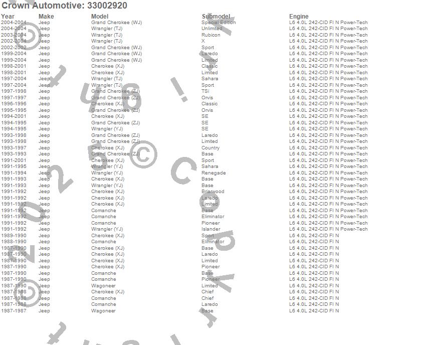 Cherokee (XJ), Comanche, Grand Cherokee (WJ), Grand Cherokee (ZJ), Wagoneer, Wrangler (LJ), Wrangler (TJ), Wrangler (YJ), Jeep, 2004, 2003, 2002, 2001, 2000, 1999, 1998, 1997, 1996, 1995, 1994 more…