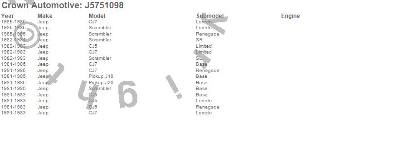 Crown Automotive is the premier manufacturer and distributor of quality replacement parts for Jeep® CJ™, Wrangler™, Cherokee™, Grand Cherokee™, Liberty™, and Commander™."From humble beginnings in 1963 in a small Boston storefront, Crown Automotive has consistently maintained its commitment to offering only quality parts and exceptional service. Today, with warehouses in Massachusetts, Georgia, Nevada, Spain, and the Czech Republic, totaling over 160,000 square feet, Crown Automotive continues to be the leader in quality replacement parts for Jeep® vehicles. With over 8,000 different parts in stock for Jeep® vehicles from 1942 on up, Crown has the largest stock of replacement parts for Jeep® vehicles, including factory-discontinued parts. In fact, many of the older Jeeps are still on (and off) the road thanks to Crown parts. The Crown line consists of axle, body, brake, clutch, cooling, driveline, electrical, engine, exhaust, fuel, steering, suspension, transmission and transfer case components. Crown Automotive also offers an exclusive line of component kits and accessory products. Because we know that Jeeps are driven harder than most other vehicles, we emphasize offering only quality parts. In fact, we test parts on Jeeps before distributing them to our dealers to insure that they meet our standards for quality. Crown also supports its entire line with a 12 month/12,000 mile warranty to insure our dealers and their customers of our commitment to offering quality parts. We know from experience that Jeep® owners would rather pay a little more for a good quality part that's backed by a strong guarantee. But we know that price is important as well. So, not only will you find Crown parts to be of exceptional quality, but you'll find them at a great price too.
