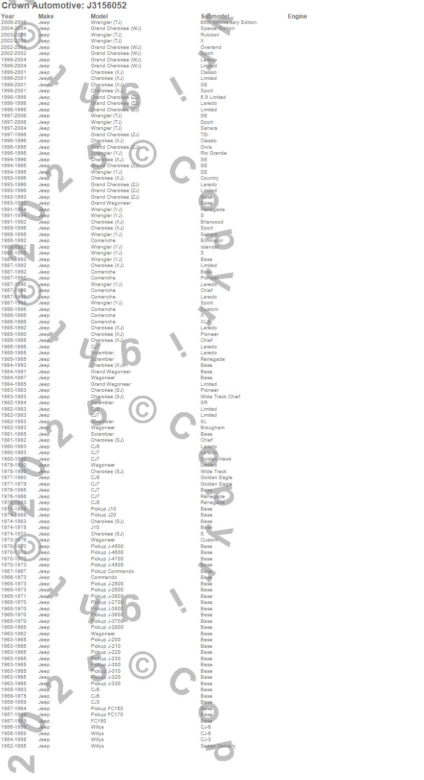 Cherokee (SJ), Cherokee (XJ), CJ-3B, CJ5, CJ6, CJ7, Comanche, Commando, FC150, FC170, Grand Cherokee (WJ), Grand Cherokee (ZJ), Grand Wagoneer, J-200, J-210, J-220, J-230, J-2500, J-2600, J-2700 more…