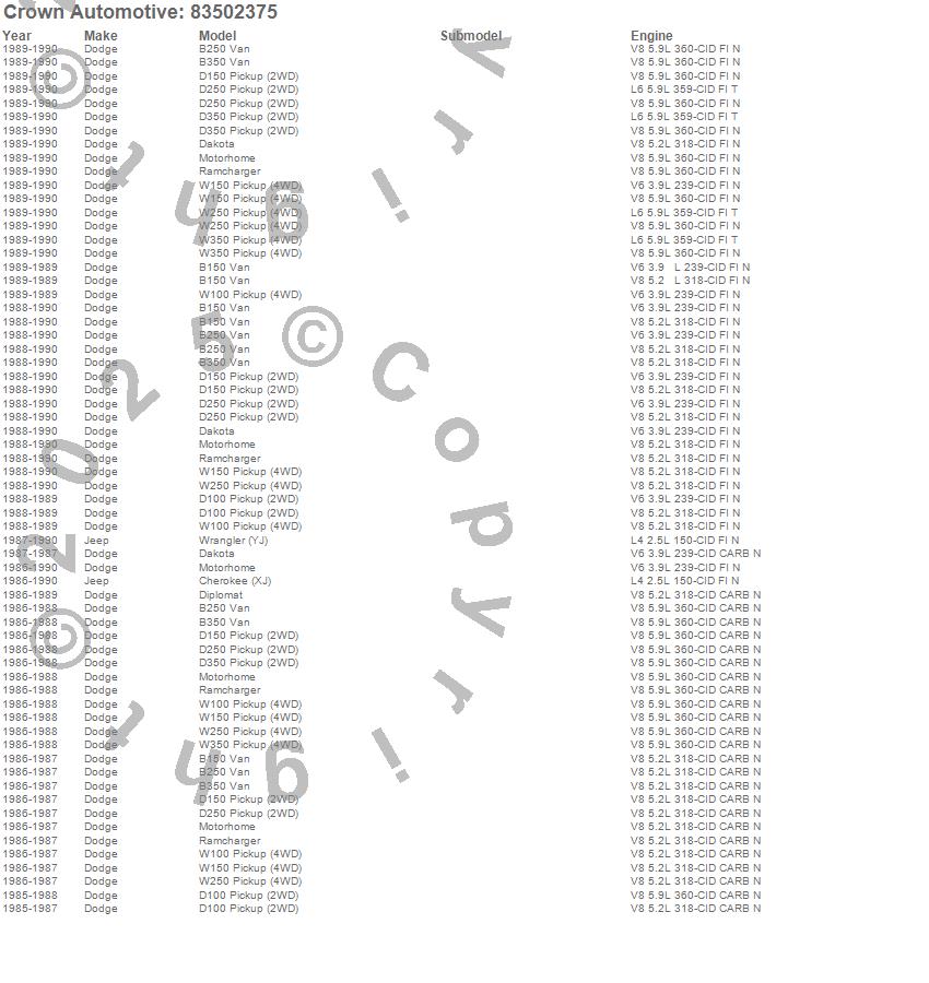 B150 Van, B250 Van, B350 Van, Cherokee (XJ), D100 Pickup, D150 Pickup, D250 Pickup, D350 Pickup, Dakota, Diplomat, Motorhome, Ramcharger, W100 Pickup, W150 Pickup, W250 Pickup, W350 Pickup, Wrangler (YJ), Dodge, Jeep, 1990 more…