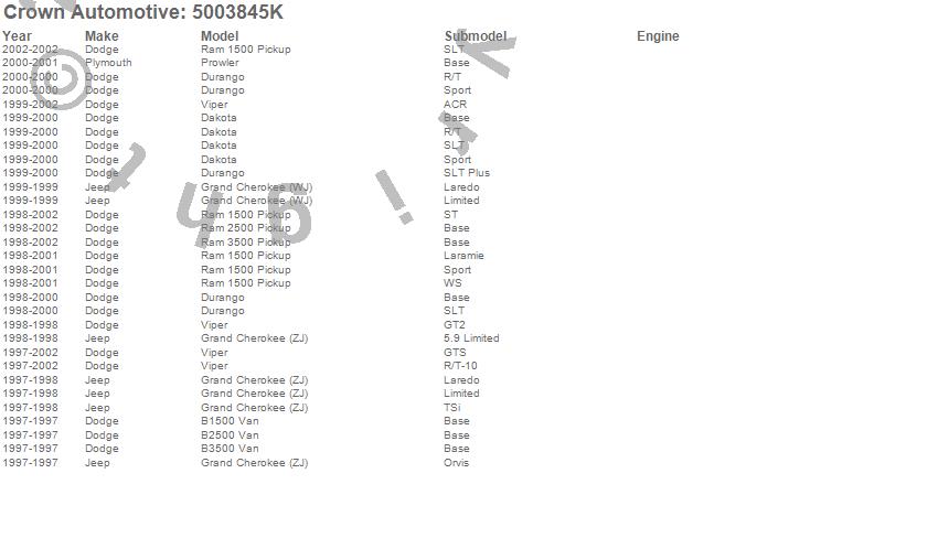 B1500 Van, B2500 Van, B3500 Van, Dakota, Durango, Grand Cherokee (WJ), Grand Cherokee (ZJ), Prowler, Ram 1500, Ram 2500, Ram 3500, Viper, Dodge, Jeep, Plymouth, 2002, 2001, 2000, 1999, 1998 more…