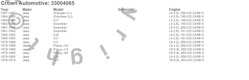 Crown Automotive is the premier manufacturer and distributor of quality replacement parts for Jeep® CJ™, Wrangler™, Cherokee™, Grand Cherokee™, Liberty™, and Commander™."From humble beginnings in 1963 in a small Boston storefront, Crown Automotive has consistently maintained its commitment to offering only quality parts and exceptional service. Today, with warehouses in Massachusetts, Georgia, Nevada, Spain, and the Czech Republic, totaling over 160,000 square feet, Crown Automotive continues to be the leader in quality replacement parts for Jeep® vehicles. With over 8,000 different parts in stock for Jeep® vehicles from 1942 on up, Crown has the largest stock of replacement parts for Jeep® vehicles, including factory-discontinued parts. In fact, many of the older Jeeps are still on (and off) the road thanks to Crown parts. The Crown line consists of axle, body, brake, clutch, cooling, driveline, electrical, engine, exhaust, fuel, steering, suspension, transmission and transfer case components. Crown Automotive also offers an exclusive line of component kits and accessory products. Because we know that Jeeps are driven harder than most other vehicles, we emphasize offering only quality parts. In fact, we test parts on Jeeps before distributing them to our dealers to insure that they meet our standards for quality. Crown also supports its entire line with a 12 month/12,000 mile warranty to insure our dealers and their customers of our commitment to offering quality parts. We know from experience that Jeep® owners would rather pay a little more for a good quality part that's backed by a strong guarantee. But we know that price is important as well. So, not only will you find Crown parts to be of exceptional quality, but you'll find them at a great price too.