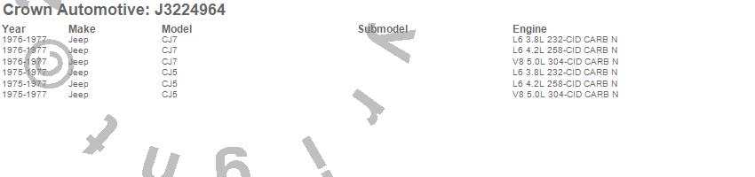 Crown Automotive is the premier manufacturer and distributor of quality replacement parts for Jeep® CJ™, Wrangler™, Cherokee™, Grand Cherokee™, Liberty™, and Commander™."From humble beginnings in 1963 in a small Boston storefront, Crown Automotive has consistently maintained its commitment to offering only quality parts and exceptional service. Today, with warehouses in Massachusetts, Georgia, Nevada, Spain, and the Czech Republic, totaling over 160,000 square feet, Crown Automotive continues to be the leader in quality replacement parts for Jeep® vehicles. With over 8,000 different parts in stock for Jeep® vehicles from 1942 on up, Crown has the largest stock of replacement parts for Jeep® vehicles, including factory-discontinued parts. In fact, many of the older Jeeps are still on (and off) the road thanks to Crown parts. The Crown line consists of axle, body, brake, clutch, cooling, driveline, electrical, engine, exhaust, fuel, steering, suspension, transmission and transfer case components. Crown Automotive also offers an exclusive line of component kits and accessory products. Because we know that Jeeps are driven harder than most other vehicles, we emphasize offering only quality parts. In fact, we test parts on Jeeps before distributing them to our dealers to insure that they meet our standards for quality. Crown also supports its entire line with a 12 month/12,000 mile warranty to insure our dealers and their customers of our commitment to offering quality parts. We know from experience that Jeep® owners would rather pay a little more for a good quality part that's backed by a strong guarantee. But we know that price is important as well. So, not only will you find Crown parts to be of exceptional quality, but you'll find them at a great price too.