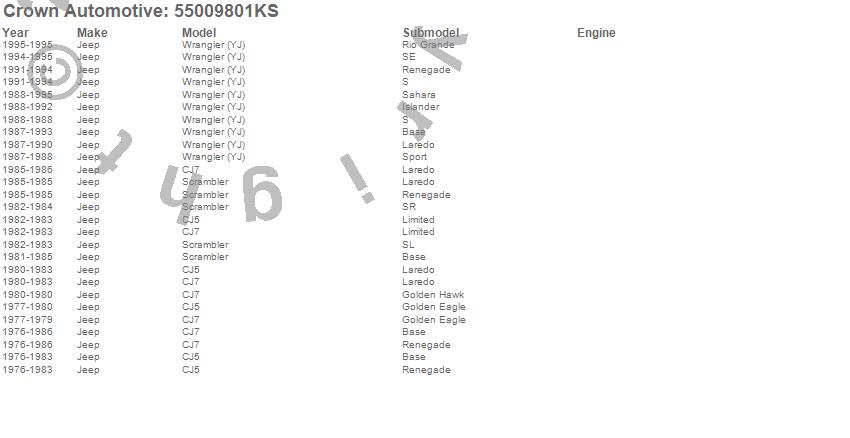 Crown Automotive is the premier manufacturer and distributor of quality replacement parts for Jeep® CJ™, Wrangler™, Cherokee™, Grand Cherokee™, Liberty™, and Commander™."From humble beginnings in 1963 in a small Boston storefront, Crown Automotive has consistently maintained its commitment to offering only quality parts and exceptional service. Today, with warehouses in Massachusetts, Georgia, Nevada, Spain, and the Czech Republic, totaling over 160,000 square feet, Crown Automotive continues to be the leader in quality replacement parts for Jeep® vehicles. With over 8,000 different parts in stock for Jeep® vehicles from 1942 on up, Crown has the largest stock of replacement parts for Jeep® vehicles, including factory-discontinued parts. In fact, many of the older Jeeps are still on (and off) the road thanks to Crown parts. The Crown line consists of axle, body, brake, clutch, cooling, driveline, electrical, engine, exhaust, fuel, steering, suspension, transmission and transfer case components. Crown Automotive also offers an exclusive line of component kits and accessory products. Because we know that Jeeps are driven harder than most other vehicles, we emphasize offering only quality parts. In fact, we test parts on Jeeps before distributing them to our dealers to insure that they meet our standards for quality. Crown also supports its entire line with a 12 month/12,000 mile warranty to insure our dealers and their customers of our commitment to offering quality parts. We know from experience that Jeep® owners would rather pay a little more for a good quality part that's backed by a strong guarantee. But we know that price is important as well. So, not only will you find Crown parts to be of exceptional quality, but you'll find them at a great price too.