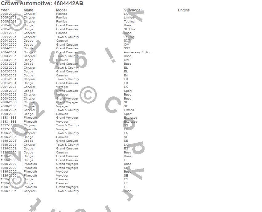 Caravan, Grand Caravan, Grand Voyager, Pacifica, Town & Country, Voyager, Chrysler, Dodge, Plymouth, 2008, 2007, 2006, 2005, 2004, 2003, 2002, 2001, 2000, 1999, 1998 more…