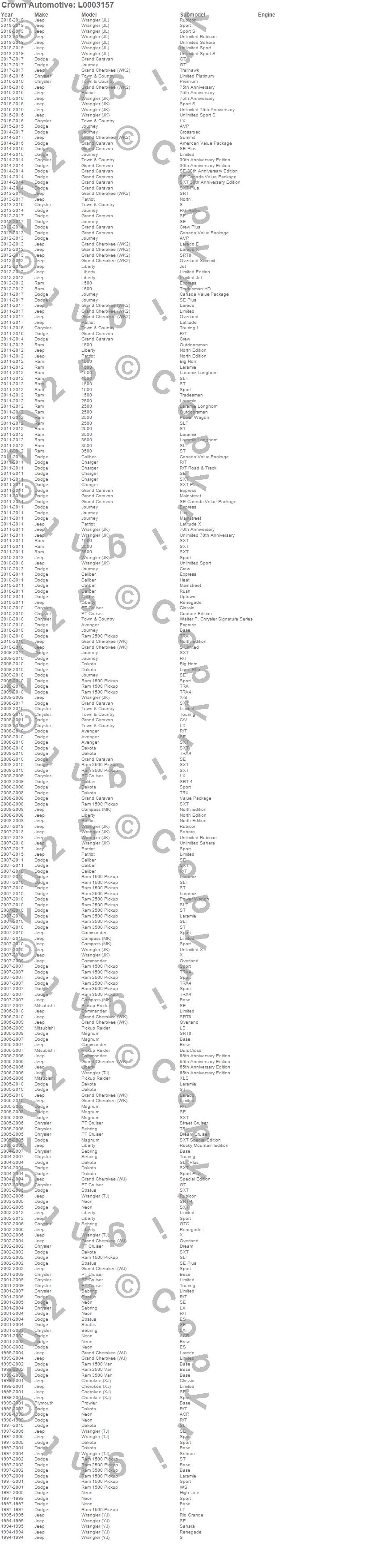 1500, 2500, 3500, Avenger, Caliber, Charger, Cherokee (XJ), Commander, Compass, Dakota, Grand Caravan, Grand Cherokee (WJ), Grand Cherokee (WK), Grand Cherokee (WK2), Journey, Liberty, Magnum, Neon, Patriot, Prowler more…
