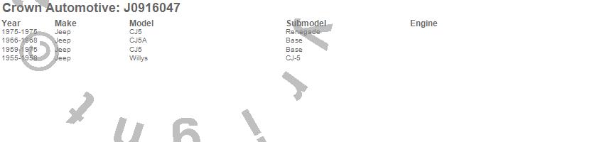Crown Automotive is the premier manufacturer and distributor of quality replacement parts for Jeep® CJ™, Wrangler™, Cherokee™, Grand Cherokee™, Liberty™, and Commander™."From humble beginnings in 1963 in a small Boston storefront, Crown Automotive has consistently maintained its commitment to offering only quality parts and exceptional service. Today, with warehouses in Massachusetts, Georgia, Nevada, Spain, and the Czech Republic, totaling over 160,000 square feet, Crown Automotive continues to be the leader in quality replacement parts for Jeep® vehicles. With over 8,000 different parts in stock for Jeep® vehicles from 1942 on up, Crown has the largest stock of replacement parts for Jeep® vehicles, including factory-discontinued parts. In fact, many of the older Jeeps are still on (and off) the road thanks to Crown parts. The Crown line consists of axle, body, brake, clutch, cooling, driveline, electrical, engine, exhaust, fuel, steering, suspension, transmission and transfer case components. Crown Automotive also offers an exclusive line of component kits and accessory products. Because we know that Jeeps are driven harder than most other vehicles, we emphasize offering only quality parts. In fact, we test parts on Jeeps before distributing them to our dealers to insure that they meet our standards for quality. Crown also supports its entire line with a 12 month/12,000 mile warranty to insure our dealers and their customers of our commitment to offering quality parts. We know from experience that Jeep® owners would rather pay a little more for a good quality part that's backed by a strong guarantee. But we know that price is important as well. So, not only will you find Crown parts to be of exceptional quality, but you'll find them at a great price too.