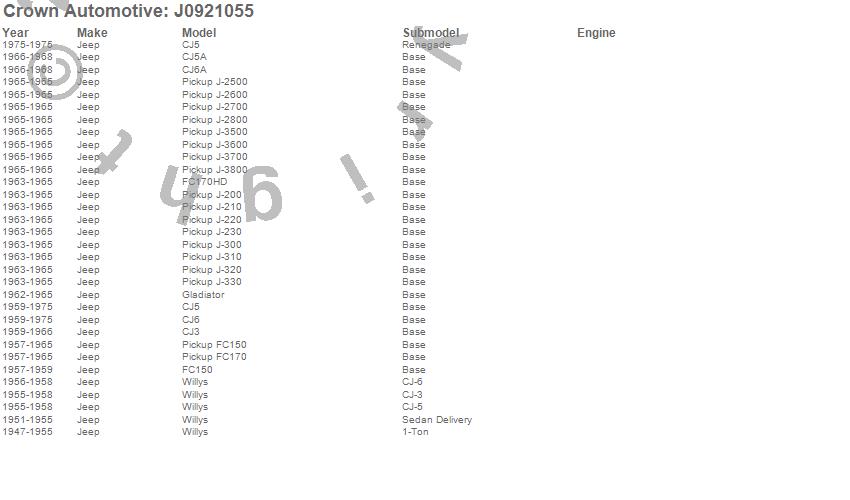 Crown Automotive is the premier manufacturer and distributor of quality replacement parts for Jeep® CJ™, Wrangler™, Cherokee™, Grand Cherokee™, Liberty™, and Commander™."From humble beginnings in 1963 in a small Boston storefront, Crown Automotive has consistently maintained its commitment to offering only quality parts and exceptional service. Today, with warehouses in Massachusetts, Georgia, Nevada, Spain, and the Czech Republic, totaling over 160,000 square feet, Crown Automotive continues to be the leader in quality replacement parts for Jeep® vehicles. With over 8,000 different parts in stock for Jeep® vehicles from 1942 on up, Crown has the largest stock of replacement parts for Jeep® vehicles, including factory-discontinued parts. In fact, many of the older Jeeps are still on (and off) the road thanks to Crown parts. The Crown line consists of axle, body, brake, clutch, cooling, driveline, electrical, engine, exhaust, fuel, steering, suspension, transmission and transfer case components. Crown Automotive also offers an exclusive line of component kits and accessory products. Because we know that Jeeps are driven harder than most other vehicles, we emphasize offering only quality parts. In fact, we test parts on Jeeps before distributing them to our dealers to insure that they meet our standards for quality. Crown also supports its entire line with a 12 month/12,000 mile warranty to insure our dealers and their customers of our commitment to offering quality parts. We know from experience that Jeep® owners would rather pay a little more for a good quality part that's backed by a strong guarantee. But we know that price is important as well. So, not only will you find Crown parts to be of exceptional quality, but you'll find them at a great price too.