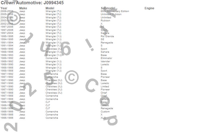Crown Automotive is the premier manufacturer and distributor of quality replacement parts for Jeep® CJ™, Wrangler™, Cherokee™, Grand Cherokee™, Liberty™, and Commander™."From humble beginnings in 1963 in a small Boston storefront, Crown Automotive has consistently maintained its commitment to offering only quality parts and exceptional service. Today, with warehouses in Massachusetts, Georgia, Nevada, Spain, and the Czech Republic, totaling over 160,000 square feet, Crown Automotive continues to be the leader in quality replacement parts for Jeep® vehicles. With over 8,000 different parts in stock for Jeep® vehicles from 1942 on up, Crown has the largest stock of replacement parts for Jeep® vehicles, including factory-discontinued parts. In fact, many of the older Jeeps are still on (and off) the road thanks to Crown parts. The Crown line consists of axle, body, brake, clutch, cooling, driveline, electrical, engine, exhaust, fuel, steering, suspension, transmission and transfer case components. Crown Automotive also offers an exclusive line of component kits and accessory products. Because we know that Jeeps are driven harder than most other vehicles, we emphasize offering only quality parts. In fact, we test parts on Jeeps before distributing them to our dealers to insure that they meet our standards for quality. Crown also supports its entire line with a 12 month/12,000 mile warranty to insure our dealers and their customers of our commitment to offering quality parts. We know from experience that Jeep® owners would rather pay a little more for a good quality part that's backed by a strong guarantee. But we know that price is important as well. So, not only will you find Crown parts to be of exceptional quality, but you'll find them at a great price too.