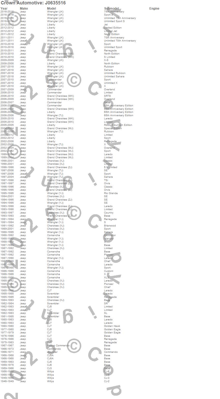 Crown Automotive is the premier manufacturer and distributor of quality replacement parts for Jeep® CJ™, Wrangler™, Cherokee™, Grand Cherokee™, Liberty™, and Commander™."From humble beginnings in 1963 in a small Boston storefront, Crown Automotive has consistently maintained its commitment to offering only quality parts and exceptional service. Today, with warehouses in Massachusetts, Georgia, Nevada, Spain, and the Czech Republic, totaling over 160,000 square feet, Crown Automotive continues to be the leader in quality replacement parts for Jeep® vehicles. With over 8,000 different parts in stock for Jeep® vehicles from 1942 on up, Crown has the largest stock of replacement parts for Jeep® vehicles, including factory-discontinued parts. In fact, many of the older Jeeps are still on (and off) the road thanks to Crown parts. The Crown line consists of axle, body, brake, clutch, cooling, driveline, electrical, engine, exhaust, fuel, steering, suspension, transmission and transfer case components. Crown Automotive also offers an exclusive line of component kits and accessory products. Because we know that Jeeps are driven harder than most other vehicles, we emphasize offering only quality parts. In fact, we test parts on Jeeps before distributing them to our dealers to insure that they meet our standards for quality. Crown also supports its entire line with a 12 month/12,000 mile warranty to insure our dealers and their customers of our commitment to offering quality parts. We know from experience that Jeep® owners would rather pay a little more for a good quality part that's backed by a strong guarantee. But we know that price is important as well. So, not only will you find Crown parts to be of exceptional quality, but you'll find them at a great price too.